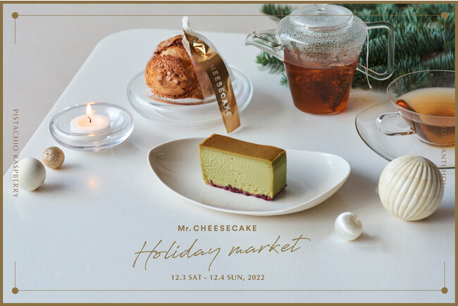 株式会社Mr. CHEESECAKE(本社:東京都港区 代表取締役:田村浩二)は、ホリデー限定フレーバー「Mr. CHEESECAKE pistachio raspberry(ミスターチーズケーキ ピスタチオ ラズベリー)」を2022年12月4日(日)10:00から販売します。また、ひと足先にホリデー限定フレーバーをお楽しみいただけるポップアップイベント「Mr. CHEESECAKE Holiday Market(ミスターチーズケーキ ホリデー マーケット)」を2022年12月3日(土)と4日(日)の2日間、代官山のCANVAS TOKYO ATELIERにて開催します。