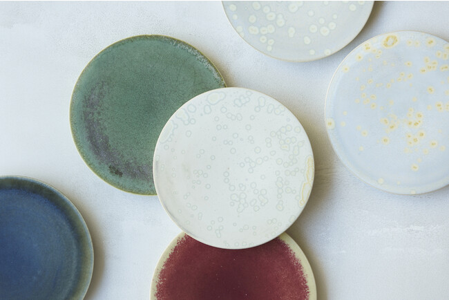 ピスタチオのしっとりとやわらかい緑とラズベリーの赤が引き立つ、ホリデー限定フレーバーのためのオリジナルプレート。この季節にぴったりな常緑樹の緑、ワインのような深い赤、冬の寒空のようなダークグレー、雪景色のような白の4色を販売します。釉薬の重ね方や焼き加減を何度も調整し生まれた、深みのある色味と質感をお楽しみください。