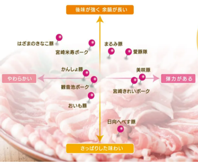 「宮崎ブランドポーク」は、宮崎ブランドポーク普及促進協議会が指定した生産者によって育てられた豚肉で、その中でも餌や飼育方法に特徴があるものを個別銘柄に認定しています。宮崎ブランドポーク普及促進協議会では、人の五感を使ってモノの特徴を分析する、”官能評価QDA”を使い、個別銘柄の風味や食感などの特徴を明らかにしました。15種類を超える個別銘柄の中から、お好みの銘柄を選ぶ楽しさを皆さまにお届けします。それぞれの銘柄は、宮崎ブランドポーク普及促進協議会のHPよりご購入いただけます。