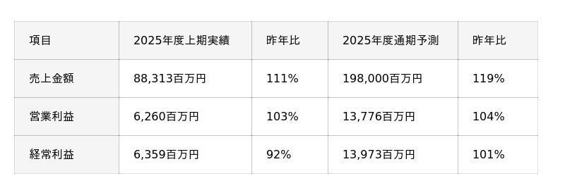 - 注記: 通期業績予測には、タイ→米国輸入関税(19%)による収益減少額が織り込み済み。