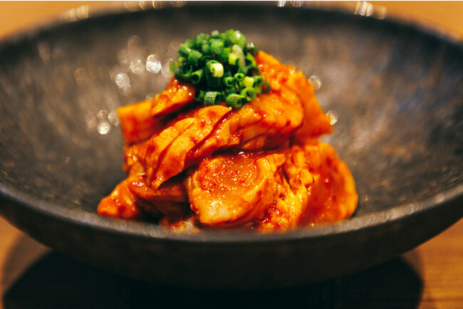 “上ミノ”の柔らかくコリコリとした食感と甘辛の特製ヤンニョムがやみつきになるひと品です。