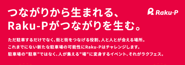 「未来の駐車場の役割ってなんだろう。」ただ駐車するだけでなく、街と街をつなげる役割、人と人とが会える場所。これまでにない新たな駐車場の可能性にRaku-Pはチャレンジします。ロック板の廃止や自動精算の導入など、利用者や街のことを考えた新たなカタチ。しかしながら、今までは駐車場はただの”駐車場”でしかありませんでした。でも街を見れば至る所に駐車場。我々はそんな日陰の存在だった”駐車場”を通して、移動に新たな価値を提供する「街づくり」に貢献することを目指しています。時には駐車場の"駐車"ではなく、人が集える"場"に変身することも。ある時には縁日を開催したりして、地域の人が集える場所にしても面白いなと思ったり。またある時には子どもに目一杯絵を描いてもらえるスペースとして、駐車場の地面を開放してもいいかもしれません。