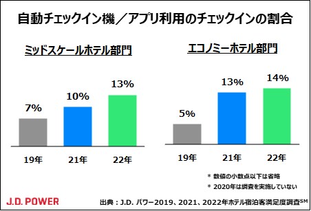 スタッフの人手不足解消や、コロナ禍で高まった非接触・非対面のニーズへの対応として「自動チェックイン機によるセルフサービスでのチェックイン」、「ホテルのアプリを使用したチェックイン」が注目されつつある。本年調査において、このようなセルフサービスでのチェックインを行った割合は、「ミッドスケールホテル部門」では13%、「エコノミーホテル部門」では14%となり、コロナ禍前の19年から一貫して増加している(下図参照)。