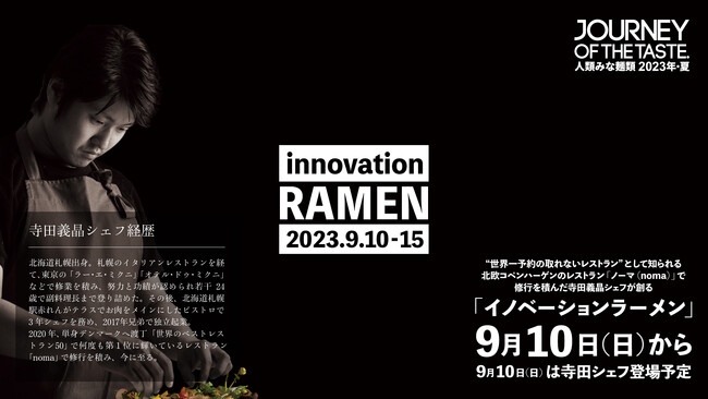 UNCHI株式会社(本社:大阪市淀川区、代表取締役:松村貴大)が運営するラーメン店「人類みな麺類(大阪・南方)」は 、この夏限定で開催しているイベント「Journey of The Taste. - 人類みな麺類 2023年・夏」のフィナーレとして、世界で最も予約の取れないレストランとしても称される「noma(ノーマ)」で修行を積んだ「寺田義晶」シェフとコラボレーションし「イノベーションラーメン」を6日間限定で通常メニューに変わり提供します。