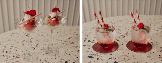 ブランドのシグネチャーであるチェリーを模った「グリオットチェリーとショコラムース」は、6月の「HER LIP TO AFTERNOON TEA」に引き続き登場する、まさにHer lip toを象徴する一品。チョコレートムースの中にスパイスで漬け込んだチェリーとバニラのクリームが口の中で芳醇に広がる、大人な味わいに仕上げました。ラズベリーを添えた「チョコレートラズベリーフィナンシェ」はミニカップケーキを想わせるクラシックスタイルでホリデーらしい華やかな印象ながら、しっかりとチョコレートの深みを感じられる上質な一品に。セイヴォリーの「ロースハムとブリーチーズのサンドイッチ」は、甘みのある黒糖と黒ゴマを練りこんだパンにロースハムの塩気とブリーチーズの香りが引き立つクセになる味わいです。またウェルカムドリンクには、ローズやライチ、ラズベリーをソーダとミックスして仕上げたHer lip toらしい華やかなノンアルコール微炭酸カクテル「クリスマスローズ」をご提供いたします。