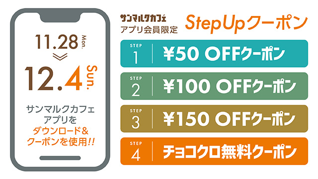 いつもご利用いただいているお客様に日頃の感謝の想いを込めて、この度「Step Upクーポン」キャンペーンを実施します。また初めてご来店いただくお客様にもクーポンを通してサンマルクカフェの商品やサービスをより知っていただける機会となっております。