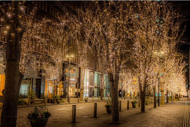 「丸の内イルミネーション 2022」は、今年で21年目を迎える恒例イベントで、約1.2km におよぶメインストリートである丸の内仲通りを中心に、有楽町駅前の東京交通会館から大手町仲通りまで丸の内エリア内340本を超える街路樹が、シャンパンゴールド色のLED約120万球で彩られます。