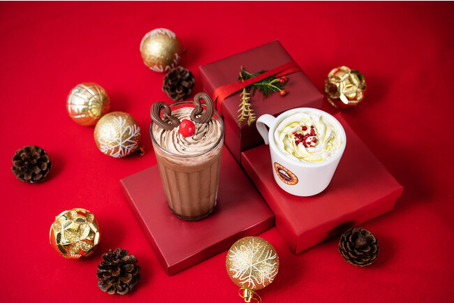 「チョコレートトナカイスムージー」は、スッキリと飲めるチョコレートスムージーに、濃厚でカカオの風味豊かなベルギーチョコホイップをトッピングしています。チョコレートとさくらんぼでかわいい赤鼻のトナカイを表現しました。トナカイの耳と、ホイップ、スムージーの3種類のチョコレートは、食感や味わいの変化を楽しめます。