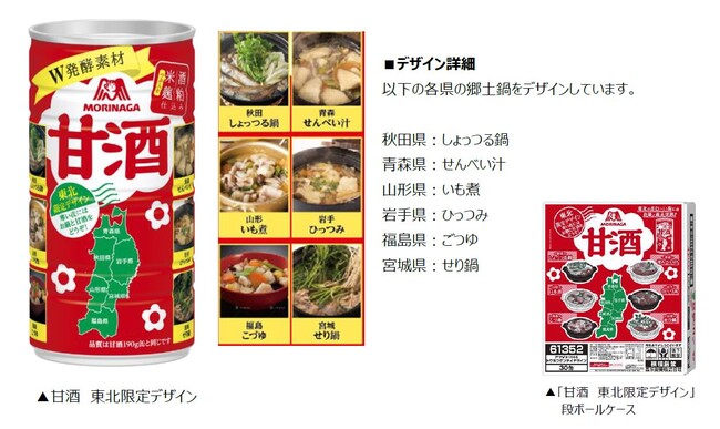 「甘酒 東北限定デザイン」は、地域の郷土鍋料理とのタイアップしたデザインです。各地域に密着したデザインにすることで、東北地方の皆様に甘酒をより身近に感じていただきたいという想いで企画しました。デザインでは、寒い夜に地域の郷土鍋と甘酒を一緒にお楽しみいただくことを提案しています。東北地方は甘酒が大変に好まれている地域で、東北地方は一人あたりの甘酒消費量が多く、一人あたりの甘酒消費量は全国平均の約1.3倍*です。また、東北地方の甘酒市場において、森永製菓のシェアは約6割※で全国平均(約3割※)を大きく上回ります。段ボールケース(30缶入り)で購入するお客様が増加していることから、購入時に楽しんでいただけるように段ボールケースも東北限定デザインにしました。