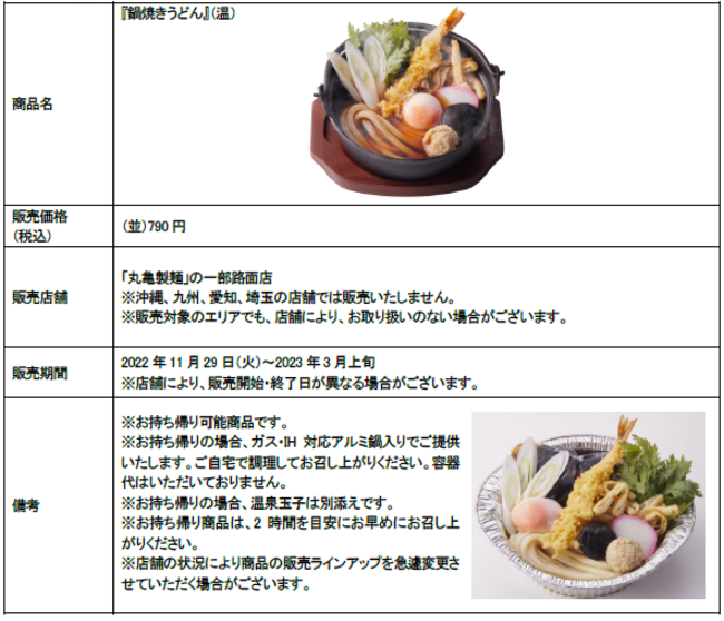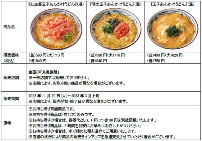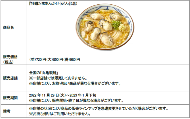 株式会社丸亀製麺(本社:東京都渋谷区、代表取締役社長:山口 寛)が展開する讃岐うどん専門店「丸亀製麺」は、2022年11月29日(火)~2023年1月下旬まで『牡蠣たまあんかけうどん』を期間限定で販売いたします。また『紅生姜玉子あんかけうどん』『明太玉子あんかけうどん』『玉子あんかけうどん』を同日より2023年3月上旬まで期間限定で販売いたします。 さらに、一部路面店では『鍋焼きうどん』も販売いたします。冬の丸亀製麺では、手づくり・できたてにこだわった、熱々のうどんを種類豊富に展開しております。寒さが本格化するこの季節に、心も身体も温めてくれる丸亀製麺の熱々もちもちのうどんをご賞味ください。