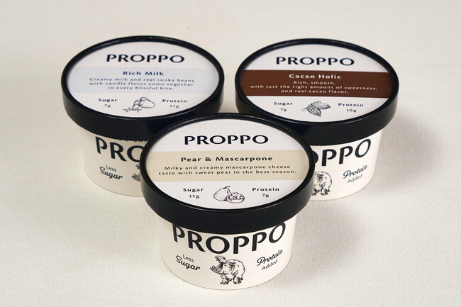 『PROPPO』は、低糖質アイスブランドです。「よくばる人生を、アイスから。」をコンセプトに、糖質50%以上カット(※)かつプロテイン含有量約10グラムという機能性と、人工甘味料不使用のナチュラルでやさしい美味しさの両立を実現し、自分へのご褒美時間をお届けします。※日本食品標準成分表2020年版 (八訂)アイスクリーム・アイスミルクと比較 (100ml換算)