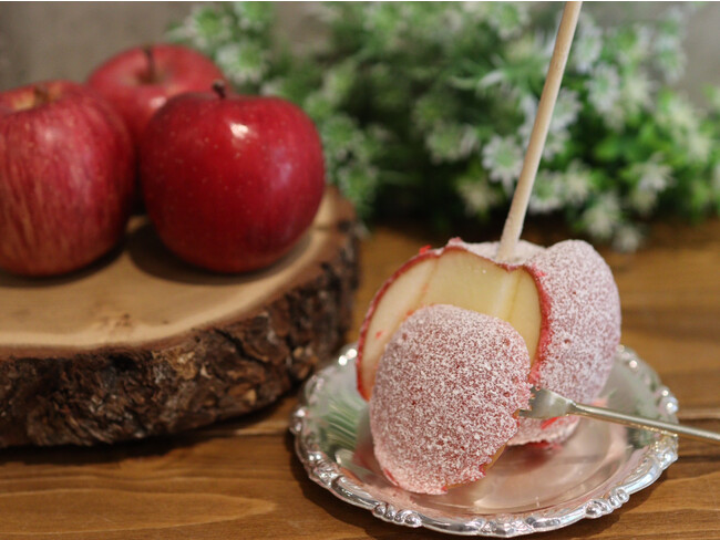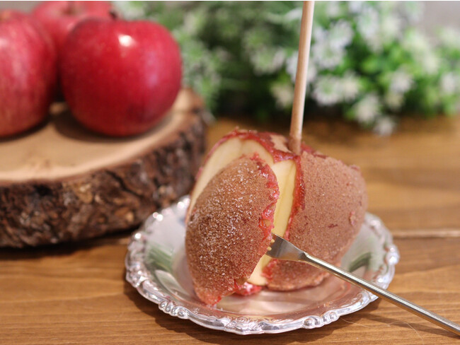 りんごの食感と、飴の食感に一体感が生まれるようにパリパリに仕上げ、ジューシーなりんごの果汁で、飴は口の中で一瞬で溶け混ざり合うよう薄くコーティングしています。そのため甘みの中に感じるりんご本来の酸味と甘い香りが口いっぱいに広がります。