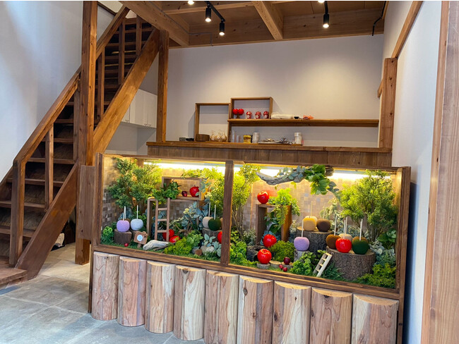 飲食店が軒を連ねる長屋の一角に古民家風カフェとしてオープンいたします。店内は落ち着いた空間となるよう天然の丸太や木材をメインに使用したナチュラルスタイルのインテリアでまとめております。1階ではりんご飴がディスプレイされた受付台がお客様をお迎えし、スタッフがご注文の受付を行います。続く2階ではイートインでりんご飴をお楽しみいただけます。