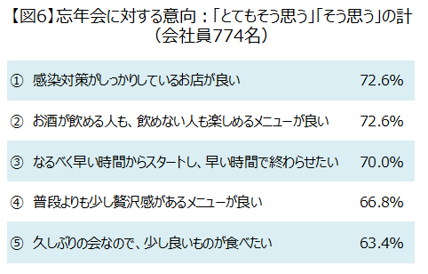 忘年会に対する意向を調査ところ、「感染対策がしっかりしているお店」との回答が72.6%と最も多いことがわかりました。(図5)