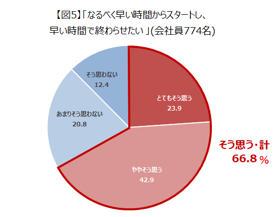 実際に、忘年会に対する気持ちを聞いたところ、「なるべく早い時間からスタートし、早い時間で終わらせたい」人は66.8%にのぼりました。