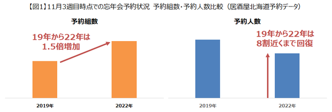 当社グループの居酒屋チェーンへの11月第3週までの忘年会予約状況をまとめたところ、新型コロナウイルス感染拡大前の2019年度と比較しても、予約組数は約1.5倍にのぼることがわかりました。予約人数としてはコロナ前までは戻っていないものの8割近くまで回復してきました。1組当たりの人数では、2019年度と比較して大人数の予約が減少したものの、少人数での忘年会需要が戻ってきているようです。(図1)