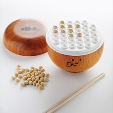 和食作法の基本であるお箸とお椀の正しい使い方を学ぶことを目的に、フジッコが開発した「まめっ子くん」を使って、1分間に利き手に持ったお箸で豆をつかみ、逆手のお椀にある穴にお豆を何粒乗せられるかを競うゲームです。