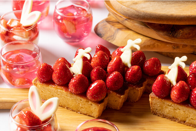 初開催となる「バニー&ストロベリー アフタヌーンティー」では、卯年にちなんで“うさぎ”をデコレーションしたいちごのスイーツが登場いたします。いちご・ラズベリー・ブルーベリーでつくる自家製ベリーソースをふわふわのスポンジ生地に染み込ませ、程よい甘さの生クリームとの相性が抜群の定番ショートケーキをはじめ、香ばしいタルト生地にいちごを乗せたストロベリータルトや優しいホワイトチョコレートの味わいとストロベリージュレがマッチするムースケーキ、軽い食感のシュー生地で生クリームとカスタードクリームをサンドしたパリブレスト、なめらかな口当たりのフランス流チーズケーキのクレームダンジュなど、いちごを思う存分ご堪能いただけるスイーツをご用意。チョコレートでつくった“うさ耳”やうさぎシェイプのデコレーションをあちらこちらに飾るほか、チョコレート味の生地でうさぎのシルエットを入れたバニラ味のパウンドケーキや、うさぎ型に焼き上げるアフタヌーンティーには欠かせないスコーンなど、さまざまなスイーツにキュートなうさぎのモチーフを見つけることができます。