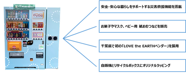 今回設置した自販機は、災害等で停電になった際に、人的操作で自販機内の商品を搬出することができる災害救援機能を搭載し、飲料に加えて、お菓子やマスク、ベビー用 紙おむつなどご利用される地域の方々の安全・安心な暮らしをサポートいたします。また本自販機では、当社がサステナブルな未来を創ることを目的に展開している「LOVE the EARTHベンダー」を採用し、自販機の年間消費電力量に相当する「再エネ指定の非化石証書※2」により、自販機稼働時のCO2排出量を実質ゼロにいたします。なお、今回の「LOVE the EARTHベンダー」は、千葉県内で初めての設置となります。