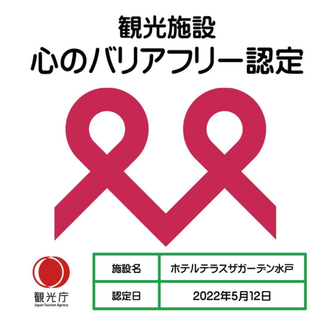 ホテルテラスザガーデン水戸はバリアフリー対応や情報発信に積極的に取り組む姿勢のある観光施設を対象とした「観光施設における心のバリアフリー認定制度」の認定を得た宿泊施設です。ご高齢の方や障害のある方がより安全で快適な旅行をするための環境整備に努めております。