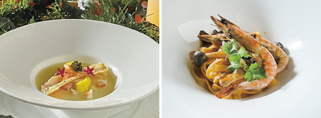 街が華やかなイルミネーションにきらめく、フェスティブの季節がやってまいりました。TRATTORIA Il Bancale「トラットリア・イルバンカーレ」では、心ときめくこの季節にお届けするクリススマスディナーを2コースご用意いたします。茨城県が誇る黒毛和牛最高ブランド・常陸牛やタラバガニ、アワビ、金目鯛など、贅沢な食材を特別な日にふさわしく華やかに仕上げました。特徴的な形と、濃厚な風味によりキノコの王様と称されるポルチーニを使用したPrimo Piattoも是非ご賞味いただきたい一品です。コンソメスープを目の前でかけていただく『金目鯛のコンソメ煮 茨城野菜とビーツを添え』『アワビと金目鯛のコンソメ煮 茨城野菜とビーツを添え』はビーツの赤が鮮やかに浮き出しクリスマス気分を盛り上げます。