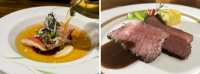アワビと金目鯛のコンソメ煮 茨城野菜とビーツを添えて