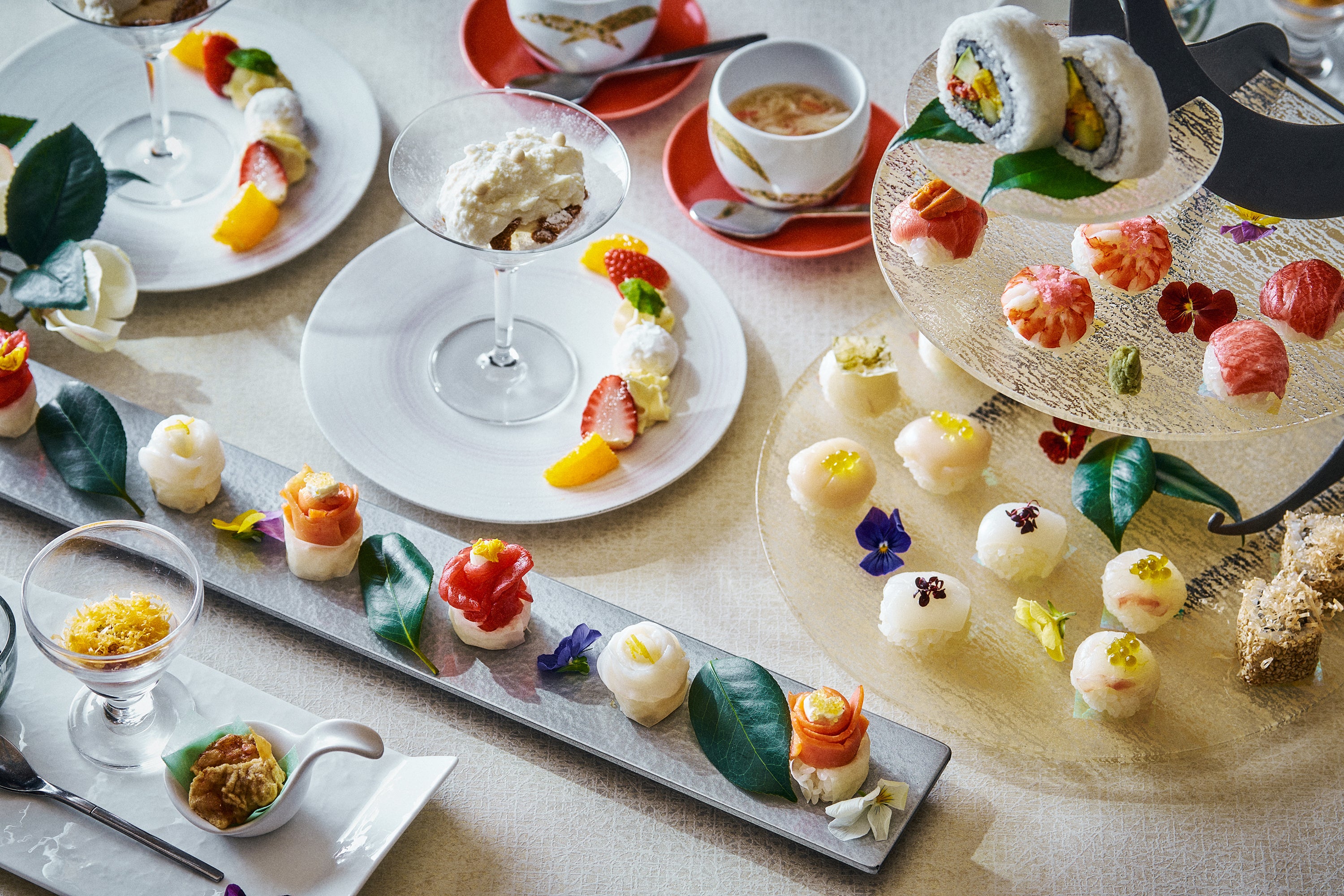澄んだ空気と共に訪れる冬の季節。“冬の日本庭園”をテーマに、カレイやズワイ蟹など季節の味覚を存分に楽しめる和のアフタヌーンティーをご用意しました。寿司職人が冬の食材の魅力を巧みに引き出し、前菜、蒸し物、甘味まで、和の趣を重ねた味わいをお楽しみいただけるアフタヌーンティーです。