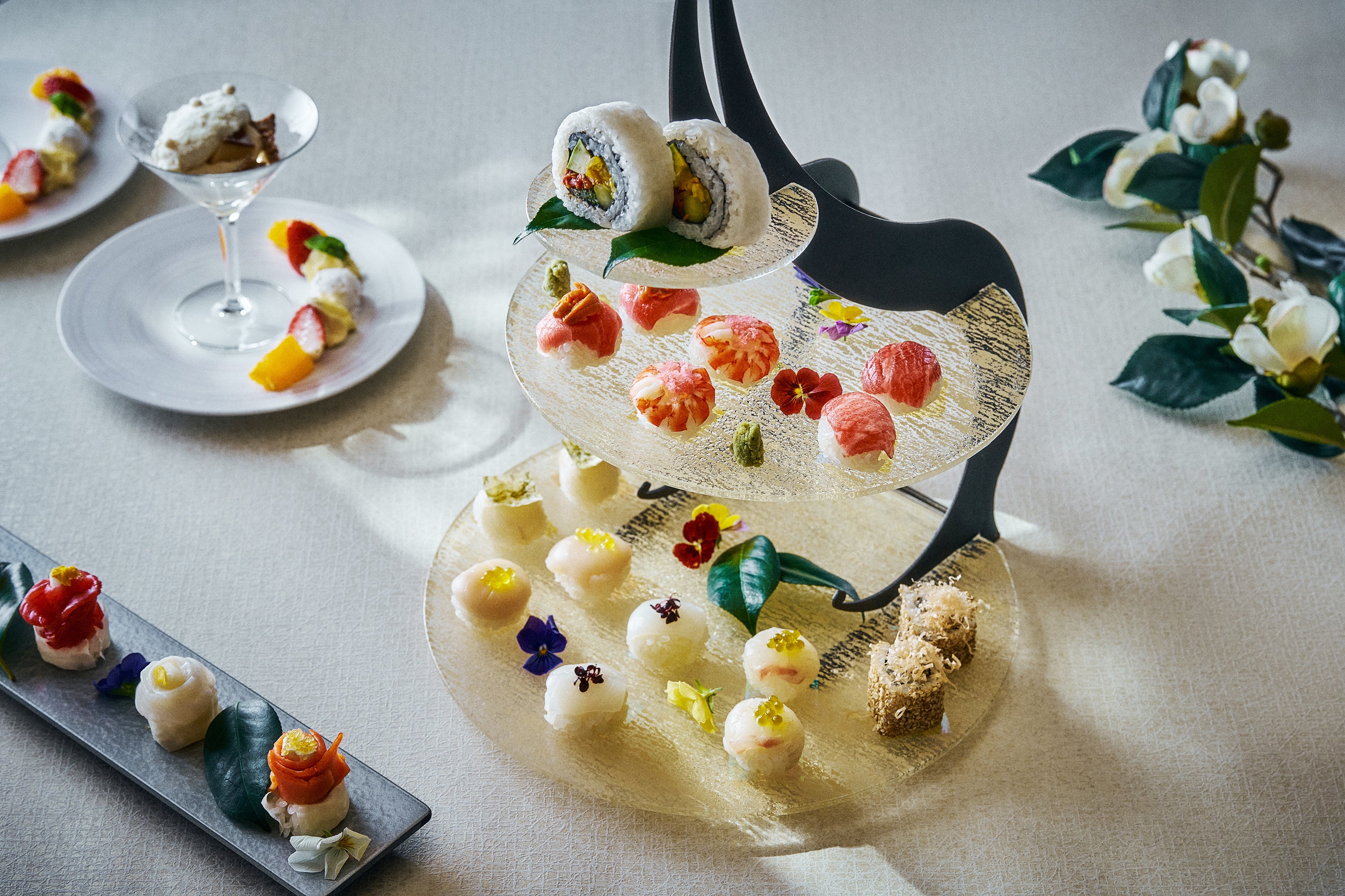 メインスタンドの手毬寿司には、大トロやウニを乗せた中トロ、真鯛にキャビアロリバジルを合わせた手毬寿司、車海老や松皮カレイ昆布締め、アボカドや大根などを重ねたベジタブルロールスノー、子持ち昆布ロールなど、冬の味覚を引き立てる手毬寿司やロール寿司が並びます。また、アレンジ寿司には、鮪と長芋の色鮮やかな寿司、柚子香る水蛸、スモークサーモンとクリームチーズにトビッコを添えた寿司で雪の降る庭園に咲く椿を表現。前菜やズワイ蟹をたっぷりとのせた茶碗蒸し、季節のフルーツと甘味を美しく盛り合わせたデザートプレートと共に優雅な冬時間をお楽しみいただけます。