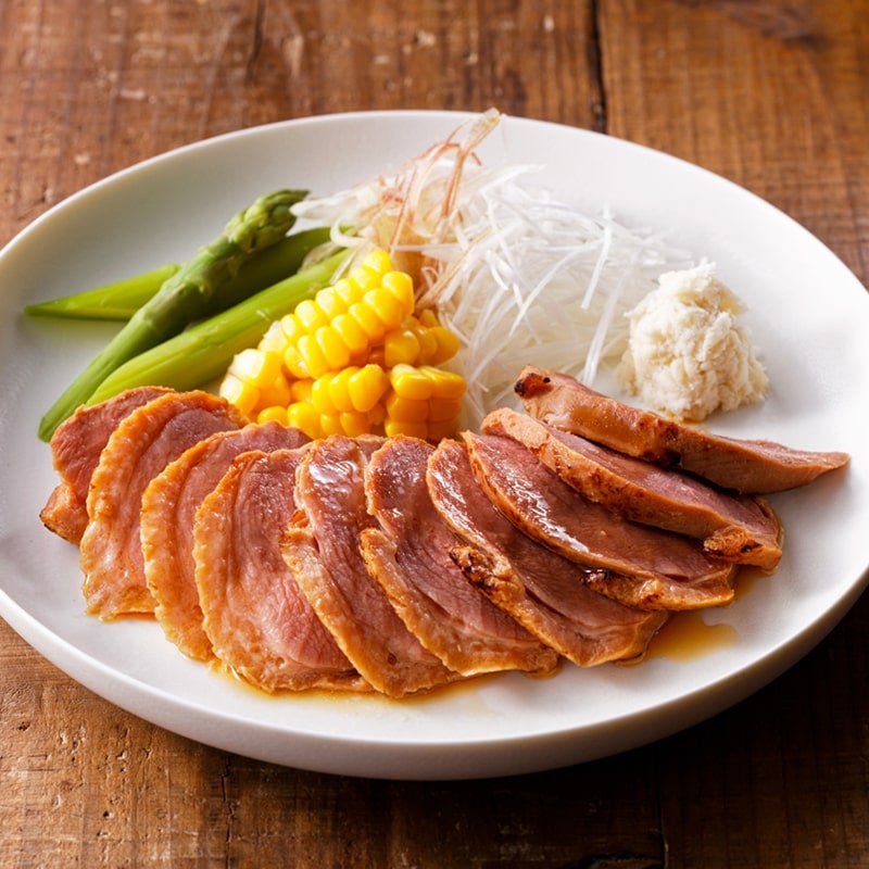 鴨肉の旨味を醤油で引き出し、しっとりやわらかく仕上げました。ワインなど、お酒との相性も抜群です。