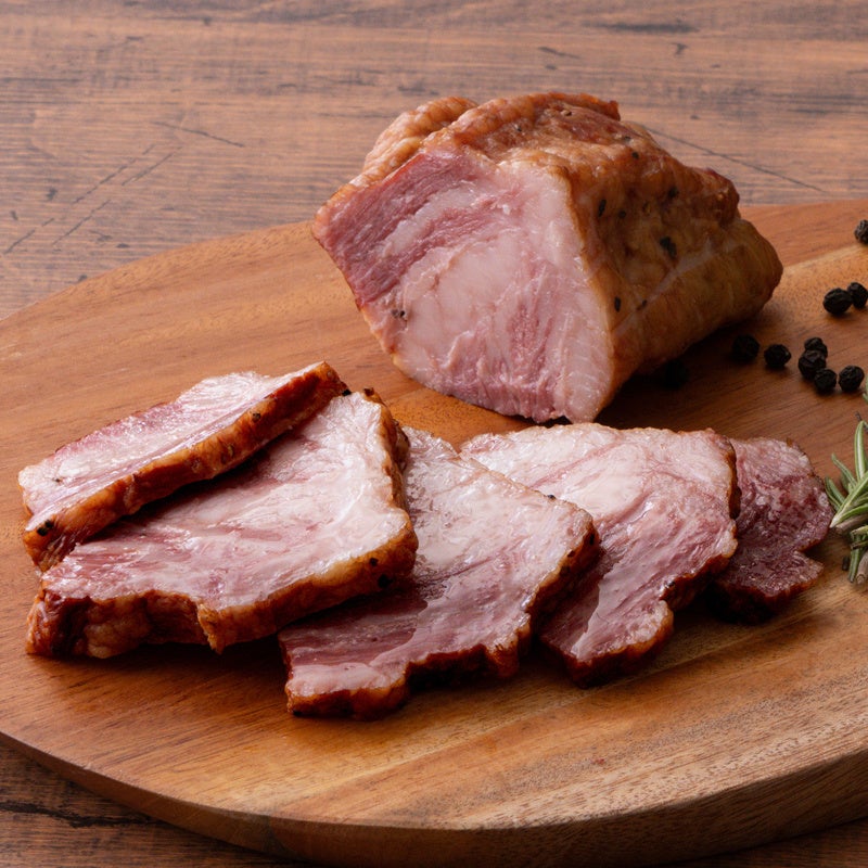 ふわりと広がる芳醇な燻製の香りに、上質な脂の甘みと凝縮した肉の旨みがとけあって、豊かにあとを引きます。そのまま召し上がれば、奥深い肉の旨みとしっとりした舌触りを。軽く焼き上げれば、脂がとろけて広がり、格別なメインディッシュに。芳醇なお酒とともに愉しむのもおすすめです。