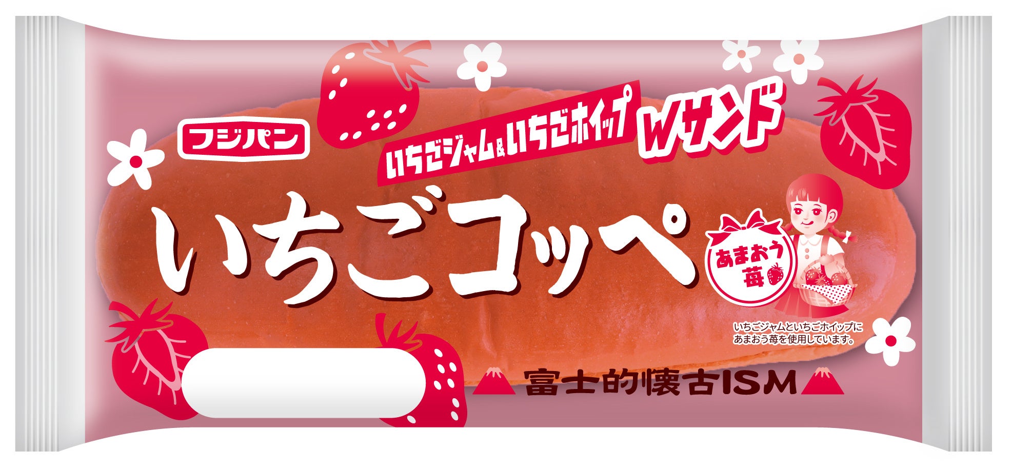 「いちごコッペ」はいちごを楽しめるコッペパンを目指しました。いちごがふんわりと香るいちご風味のパン生地に、あまおう苺を 使用したジャムとホイップクリームをWサンドしました。 ボリュームのある生地といちごづくしの味わいで満足いただける仕立てにしました。あまおう苺 を使用した いちごづくしのコッペパン「いちごコッペ」が新登場!
