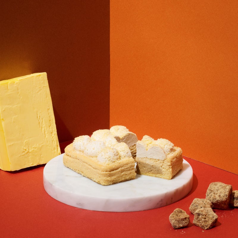 バターと黒糖を練り込んだホロホロのガレットで、黒糖フィリングを包み込みました。口の中に広がるバターと黒糖の豊かな風味をお楽しみいただけます。