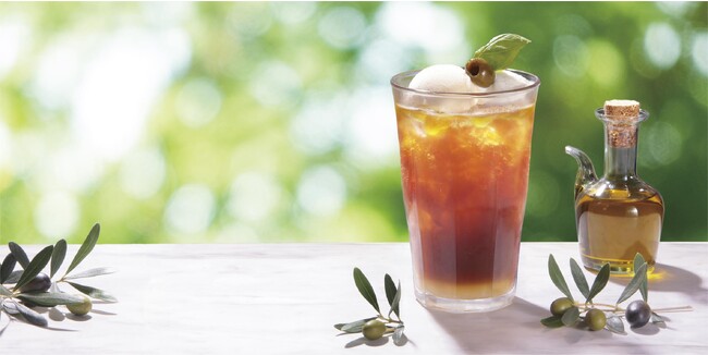 ダブルネルドリップ方式※で抽出したコーヒーを炭酸水で割って作った「コーヒースパークリング」に、シチリア産の華やかに香るオリーブとオリーブオイルを合わせた、夏にぴったりの爽やかなアレンジコーヒーです。ベースとなるダブルネルドリップコーヒーには、コロンビア産の浅炒り豆を採用しました。パパイヤや洋ナシのような明るい酸味を感じられるコーヒーの味わいが、オリーブオイルの華やかな香りをさらに引き立てます。また、サトウキビのシロップを使用し、やさしい甘みが感じられるよう味覚設計しています。さらに、シチリア産の自然な甘みのあるオリーブと、バニラアイスをトッピングしました。暑い夏にぴったりのコーヒースパークリングをお楽しみください。