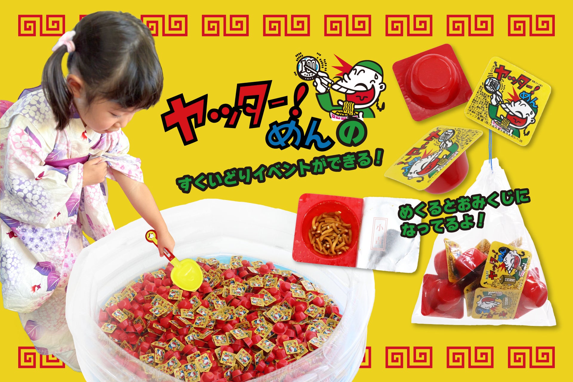 ジャック製菓の代名詞ともいえる、「ヤッター!めん」。通常のヤッター!めんは当たりに金券がついていますが、こちらはおみくじをたのしめるタイプ!イベント用プールなどにたくさんのヤッター!めんを敷き詰めて、スコップなどですくいどりをします。すくいどりのワクワク感とおみくじのドキドキ感を楽しむことができる商品です。