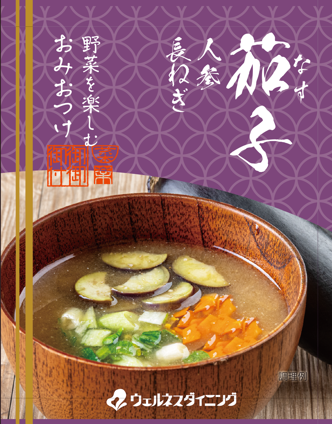 商品名:野菜を楽しむおみおつけ概要:出汁と味噌にこだわり、塩分量0.6gでも満足できる塩分を制限した味噌汁。