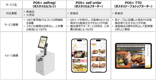 「POS+」は、店舗の売上向上や店舗運営担当者の業務負担軽減による生産性向上を実現し、また従業員にとって 利便性の高い機能を搭載する店舗向けソリューションです。飲食店向け「POS+ food」や小売業向け「POS+ retail」、理美容向け「POS+ beauty」、クリニック向けの「POS+healthcare」のクラウド型モバイルPOSレジをはじめ、セルフレジ・券売機「POS+ selfregi」、モバイルセルフオーダーサービス「POS+ self order」、テーブルトップオーダーサービス「POS+ TTO」などのさまざまなソリューションで、効率的な店舗運営を支援いたします。