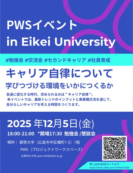 叡啓大学(学長:有信睦弘、広島市中区)は、12月5日(金)、「【PWSイベント】キャリア自律について~ 学び続ける環境をいかに作るか~」を叡啓大学のプロジェクトワークスペースで開催します。