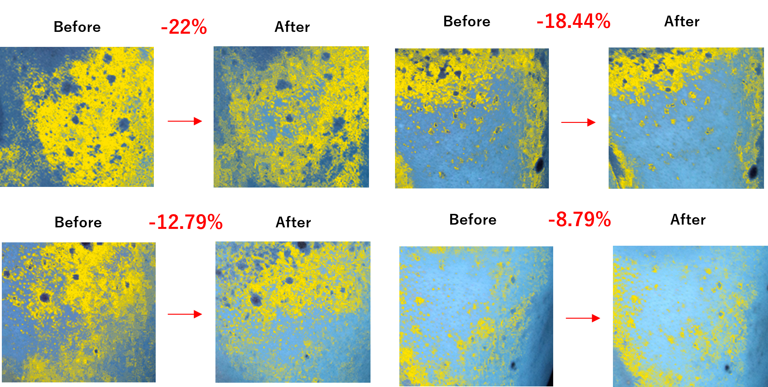「隠れジミ」は早めの対策で「シミ」になる前に予防することが重要です。今回のモニター調査結果では、約50日間のβ-カロテンの継続摂取を実施した7名のうち6名の隠れジミが、夏終わりの9月と比較して平均で13.4%減少している傾向が確認されました。