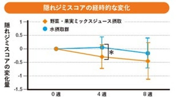その結果、野菜・果実ミックスジュースを飲んだグループは水を飲んだグループに比べて、1カ月で「隠れジミ」スコアが改善しました。また、血中のβ-カロテン濃度が高い人ほど「隠れジミ」スコアが改善する傾向もみられました。