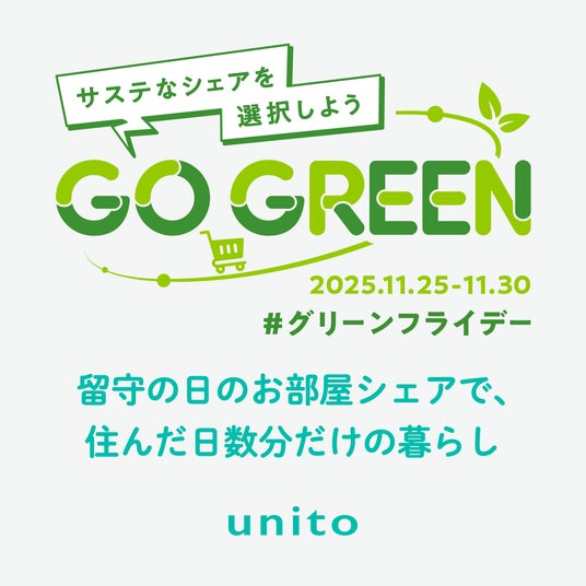 帰らない日は家賃がかからない住まい「unito」を提供する、株式会社Unito(本社:東京都目黒区、代表取締役:近藤佑太朗、以下当社)は、欧州を中心に広がるサステナブルな消費を促す「グリーンフライデー(※1)」(2025年11月28日)に合わせ、一般社団法人シェアリングエコノミー協会シェアサービス事業者19社(20サービス)と共に「GO GREENプロジェクト」を行うことをお知らせします。