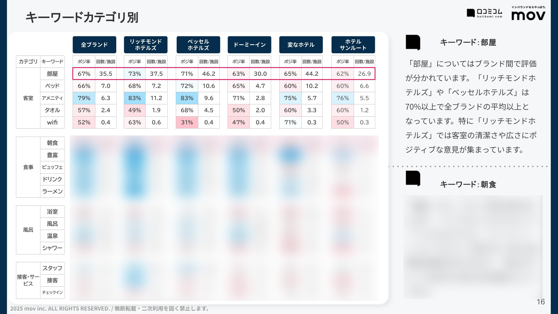 キーワード「部屋」「朝食」での各ブランドの評価