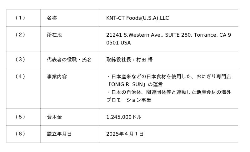KCFは、KNT-CTホールディングス株式会社(本社:東京都新宿区、代表取締役社長:小山 佳延、以下「KNT-CT」)が株式を100%保有する完全子会社です。KNT-CTは本年創立70周年を迎え、「未来創造事業」の一環として、日本産米をはじめとした日本の食材の魅力を海外へ発信し、地域活性化の支援と訪日旅行の意欲向上を目指す「コメ・イノベーション事業」を展開しています。具体的には、おにぎりの販売やコメ由来商品の販売を通して、日本産米や国産食材の海外での認知と消費拡大を図っており、2023年8月には米国・ロサンゼルスにて、日本産米にこだわったおにぎり専門店「ONIGIRI SUN」をオープン、また、今年4月には、米国にKCFを設立しました。同国での事業の拡大、そして、日本における地域活性化・農業生産者への貢献事業として、アグリツーリズム促進を推進させることを目指しています。