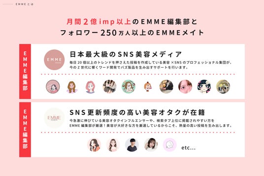 簡単&すぐに実践できる美容情報やトレンド情報を毎日発信している国内最大級(*1)のSNS美容メディア。EMME+EMME編集部アカウント合わせて、総フォロワー200万人以上、月間2億impを誇るSNS美容メディアです。