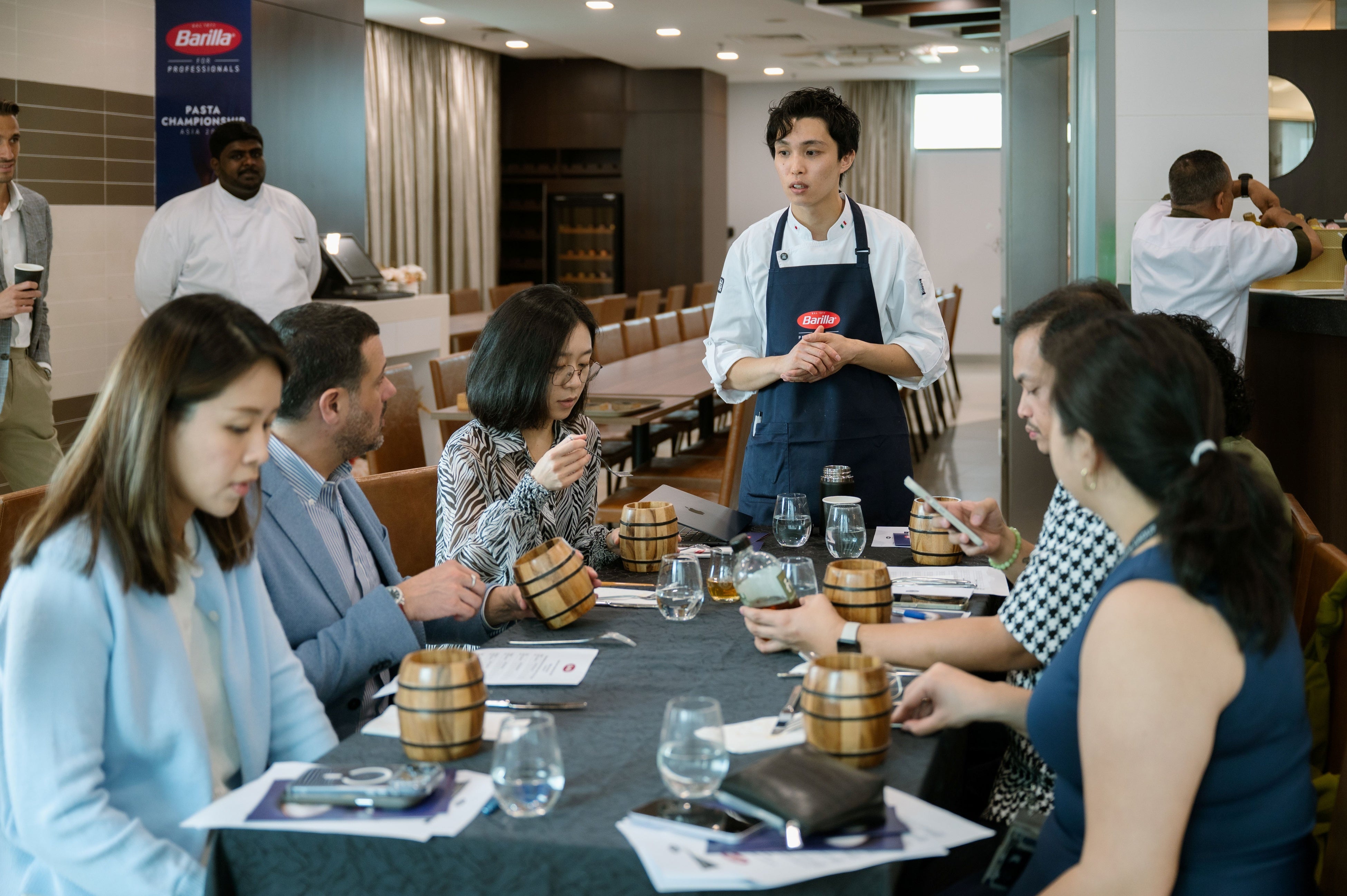 審査員には、バリラ アジア パシフィック エグゼクティブ シェフのアンドレア・トランケーロ氏、グローバル フード サービス ディレクターのニコラ・フィリッピ氏、会場となったサンウェイ大学からパトリック・シアウ氏、マレーシアプロフェッショナル・キュリネール・アソシエイト(PCA)副会長のジャーナリストのシェフ・ペレ・クアー氏の4名が名を連ねました。審査は英語で行われ、各シェフは自国の食材やアジアらしい調味料を生かした革新的なパスタを次々と作り上げました。