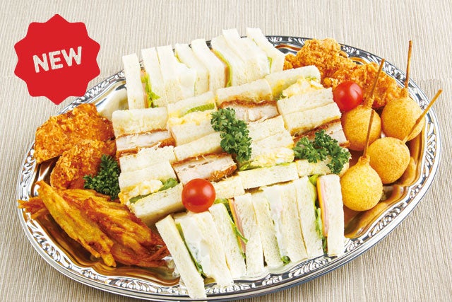 タマゴやハム、カツなどの定番サンドイッチとフライドチキン、ポテチキ、チーズボールが入ったボリューム満点のパーティーサンド。