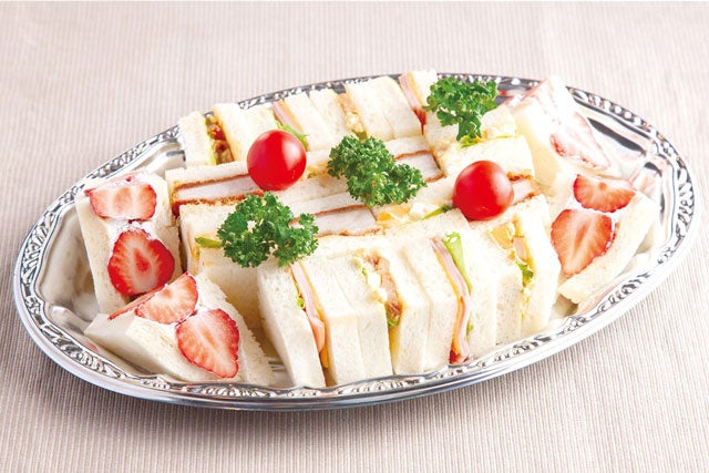 タマゴやハム、照り焼きチキンなどの定番のサンドイッチと高級食パン「そのまんま食パン」を使ったいちごのサンドイッチが入った豪華なパーティーサンド。
