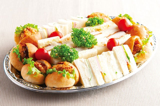 タマゴやハム、ポテトのサンドイッチやコロッケのミニバーガーなど、バラエティー豊かなサンドイッチを集めた食べごたえ抜群のパーティーサンド。
