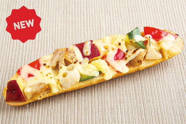 パリッと香ばしいフランスパンにホワイトソースを塗り、5種類の野菜とジューシーなチキンをごろごろのせて焼き上げました。