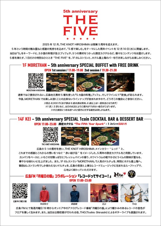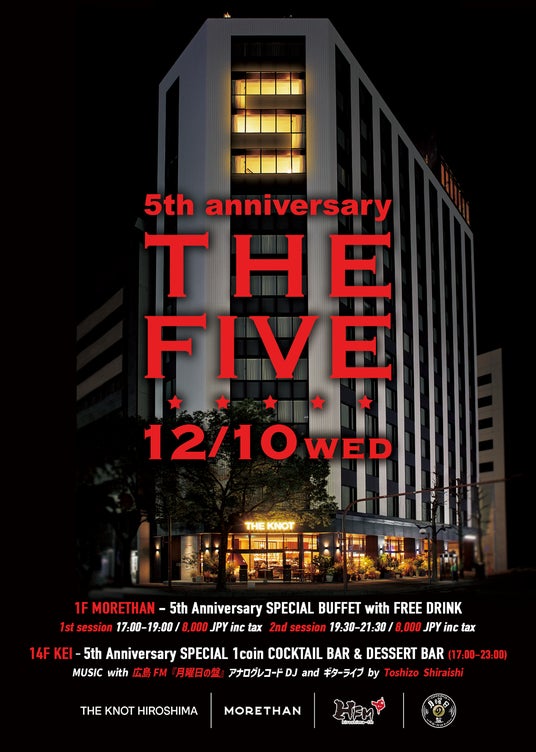 いちごは、2020年12月10日にグランドオープンしたライフスタイルホテル「THE KNOT HIROSHIMA」において、5周年となる記念イベント「THE FIVE」を来る12月10日(水)に開催いたします。1Fレストラン「MORETHAN」では、通常とは異なるこの日を記念した多彩な料理が並ぶクオリティブッフェをご満喫いただき、14F「KEI」では、この日限定のオリジナルカクテルと上質なレコードミュージックでルーフトップの夜景とともに優雅でラウンジライクなひとときをお過ごしいただけます。この機会にぜひご参加ください。