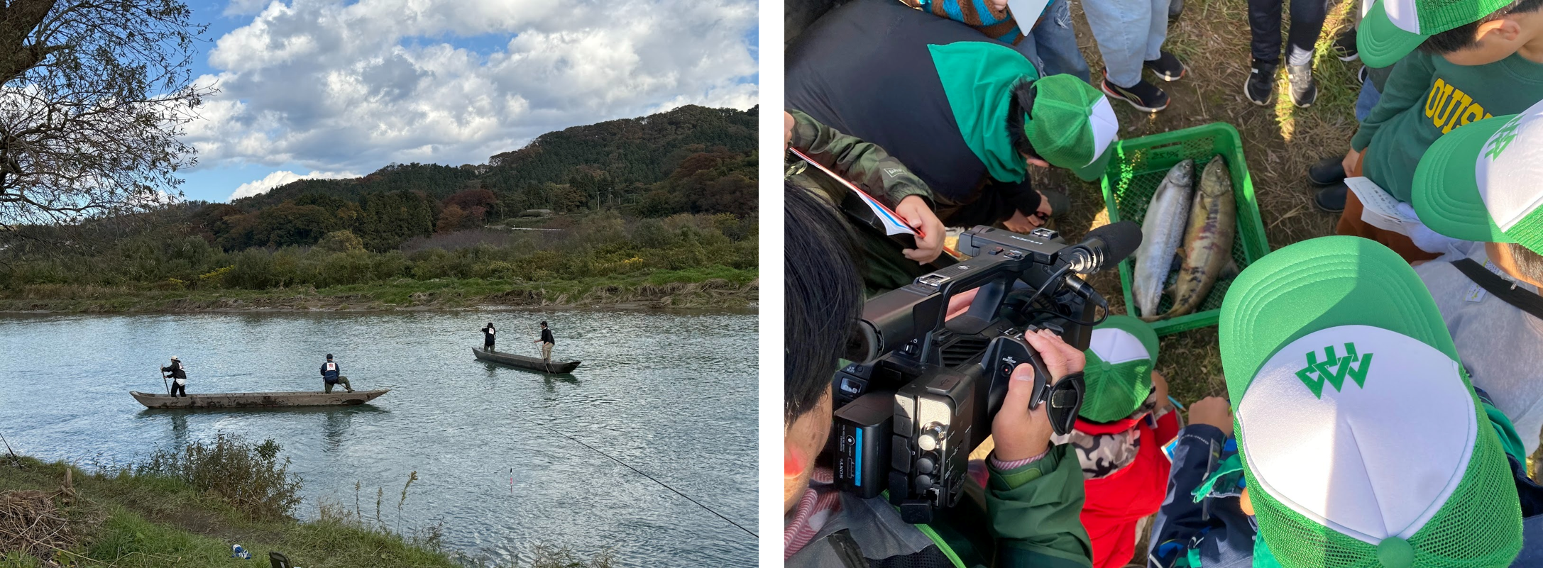 最初に訪れたのは、村上市三面川。江戸時代から続くと言われている鮭の伝統漁法である居繰網漁と、柵を利用して遡上する鮭を捕るウライ漁を見学しました。三面川鮭産漁業協同組合の佐藤克雄組合長から、鮭の生態や特徴のほか、近年の鮭漁についての説明を受けました。三面川では、10年前は50,000匹以上を漁獲していましたが、近年の漁獲量はその10分の1にまで減少。今年に至っては11月10日現在、わずか39匹とのことでした。不漁の要因の一つに、地球温暖化による海水温の上昇があることを子どもたちは学びました。鮭が捕れるか不安な中、居操網漁とウライ漁で計4匹の鮭を捕獲する現場に立ち会うことが出来ました。子どもたちは、捕れたばかりの鮭に手で触れるなどして興奮した様子でした。